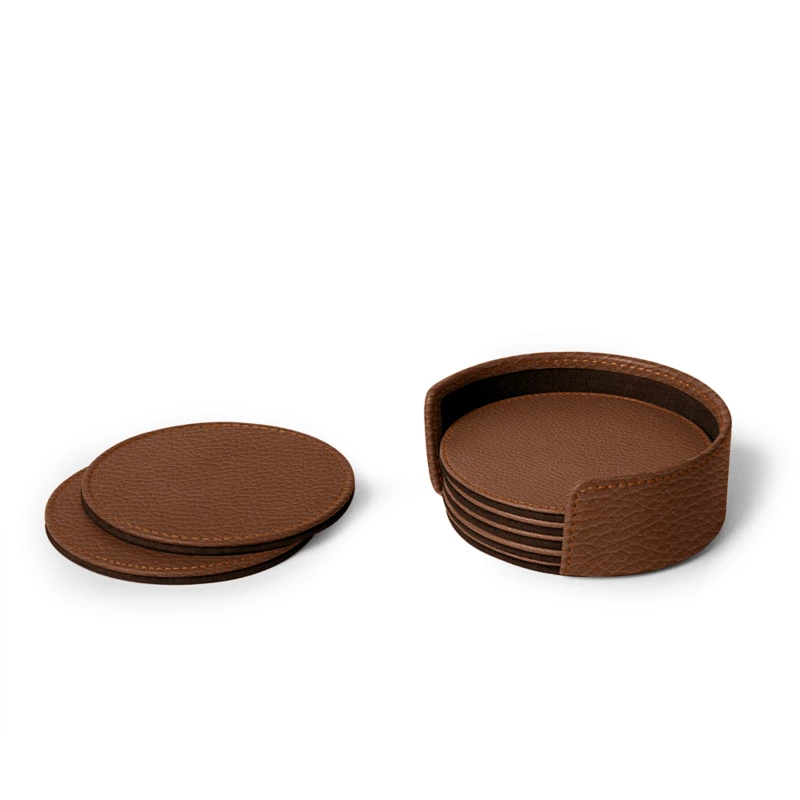 Welcome your guests with elegance using this set of 6 round coasters, thoughtfully designed to protect your table from marks and glass rings. Crafted from full-grain leather with a soft microfibre underside, each leather coaster protects even the most delicate surfaces. Stored in a matching leather case, these round coasters are perfect for both dining tables and meeting rooms — and easy to put away after use. Choose your favourite leather and colour, add a monogram, and turn this personalised coaster set into a refined accent for your space. Design yours today and serve in style.
