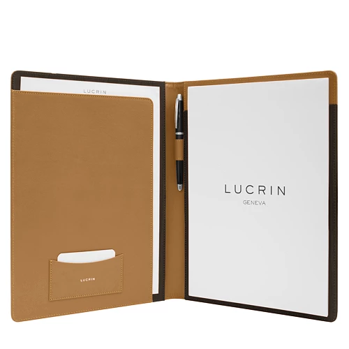 Discover one of LUCRIN Geneva’s finest creations: the A4 Portfolio crafted in premium full-grain leather. Meticulously designed with attention to detail, this leather compendium is the ideal office companion for discerning professionals. On the right side, a spacious slot holds an A4 notepad securely in place. On the left, you’ll find a flat open pocket (29 x 20.6 cm) for documents and a dedicated business card holder (10.5 x 5.1 cm). A refined pen loop—designed to accommodate writing instruments with a diameter of up to 1.4 cm—adds to its functionality. Once the included A4-format notepad is used, it can be replaced with any standard A4 or US Letter-size refill. Delivered with a complimentary A4 notepad refill, this portfolio brings together functionality, elegance, and craftsmanship in a timeless office accessory.