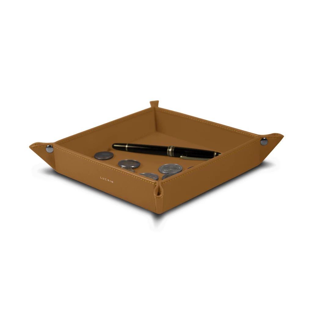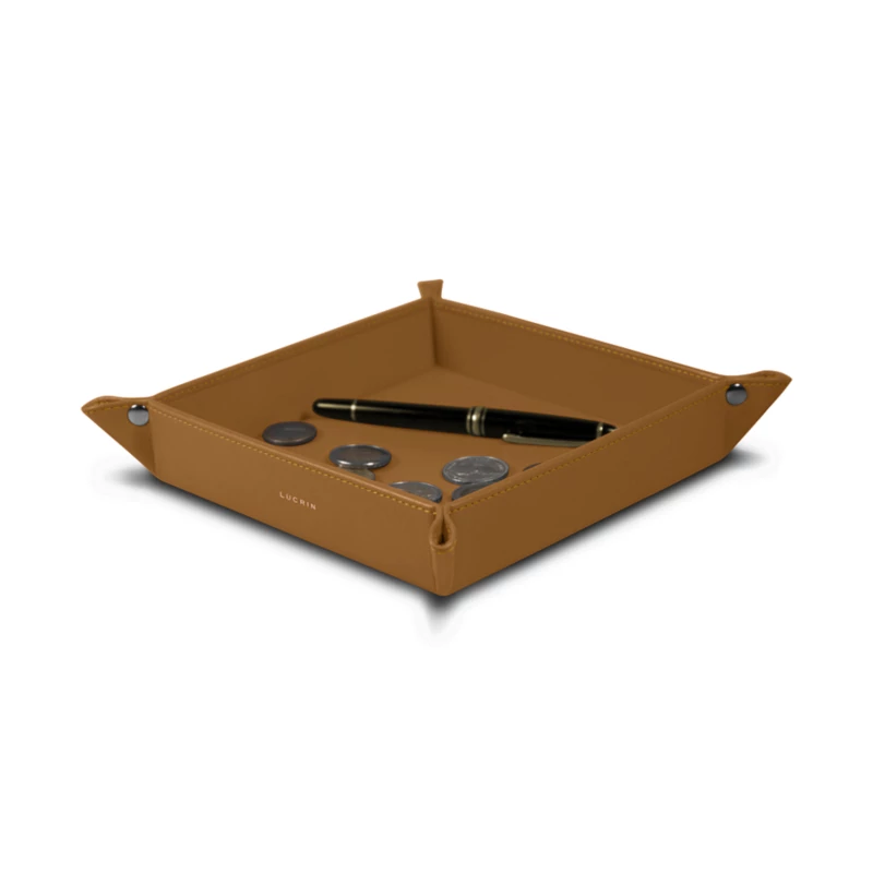 Here is the square tidy tray of our exclusive collection. Its high precision geometrical shape makes it a beautiful decorative object to be placed at the office or at home. Conceived in authentic premium leather (interior & exterior), it is held together by 4 nickeled rivets. Thanks to that elegant leather tray, you now have the perfect way to keep your desk or home console tidy as your keys, coins, pen and phone can find their place in there. This valet tray can also be a really nice gift for your closed ones, especially with some engraving options.